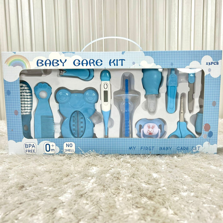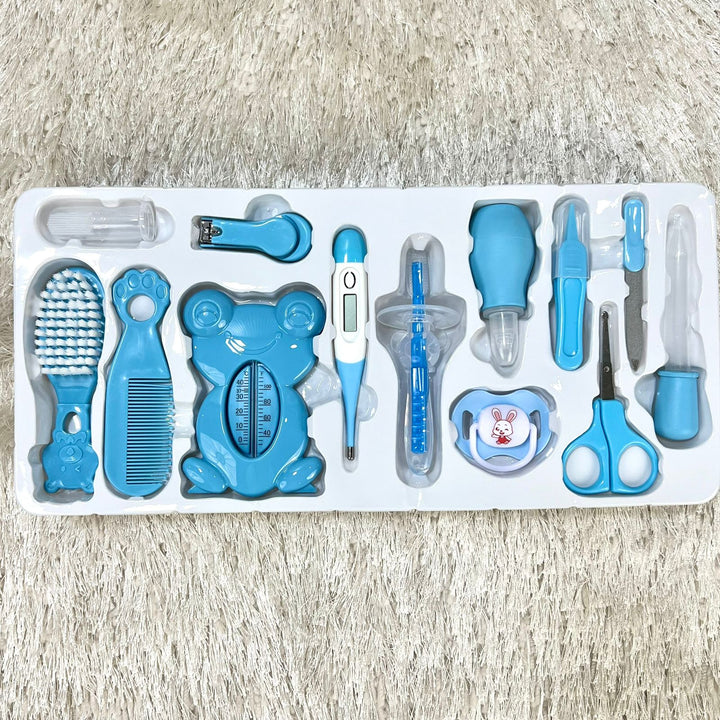 - 13 Pcs Little Star Baby Grooming All-in-On Kit Provides all the essentials needed to take care of a baby's delicate skin, nails, and hair; It includes Water Temperature Meter, Silicone Nipple, Environment-friendly Silicone Toothbrush, Silicone finger toothbrush, Nail clipper, Digital thermometer, Scissors, Comb, Hairbrush, Silicone medicine dispenser, Safe cleaning clip, Aspirator, and nail file.