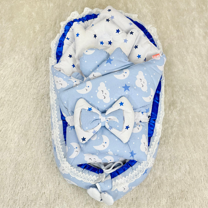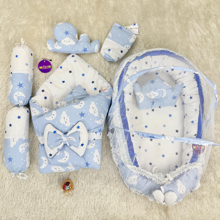 Product: 1x Snuggle bed, 1x pillow, 1x mosquito net, 1x carry nest, 1x pillow, 2x side pillows, 1x bottle cover, 1x belt
