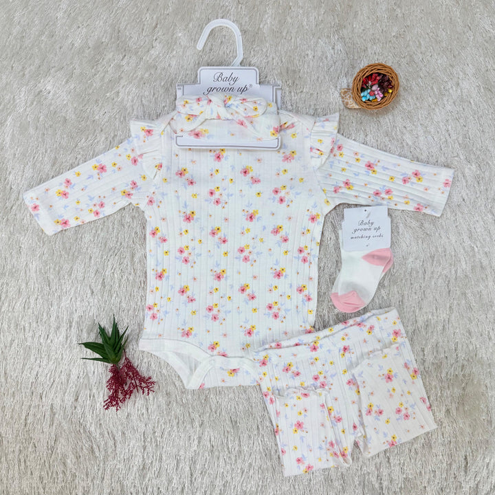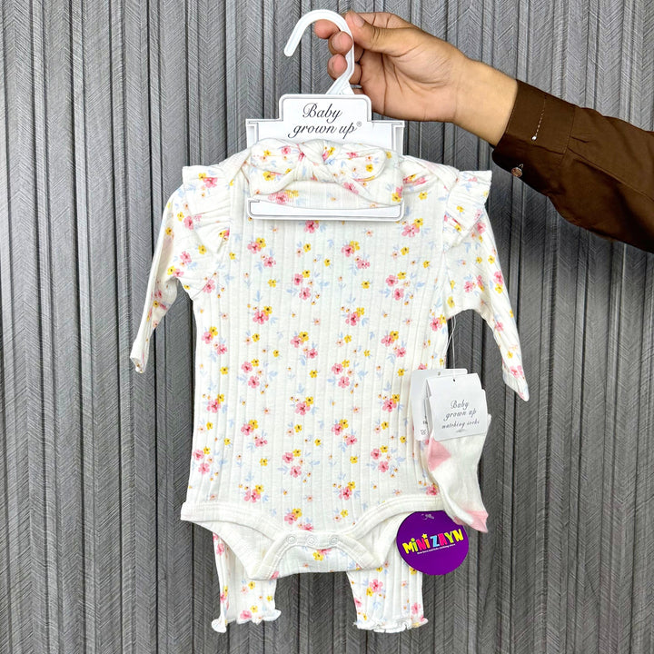 Product: 1 x bodysuit, 1 x trouser, 1 x pair of socks , 1x hairband