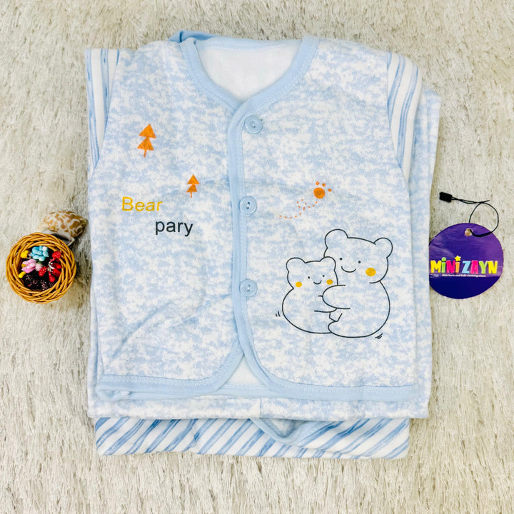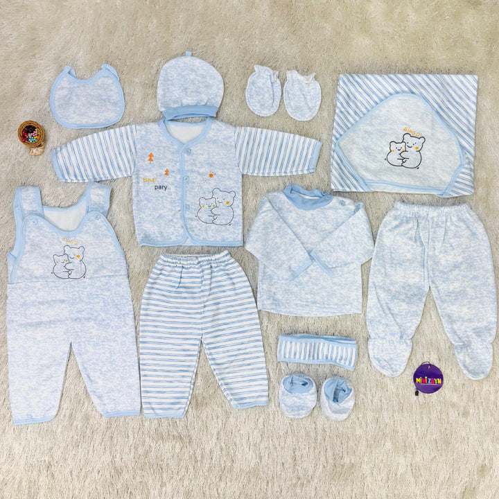 Product: 1 x open neck shirt, 1 x close neck shirt, 1 x dungaree, 1 x bib, 1 x cap, 1 x pair of mittens, 1 x pair of booties, 1 x belt, 1 x open end trouser, 1 x close feet trouser, 1 x wrapping shawl