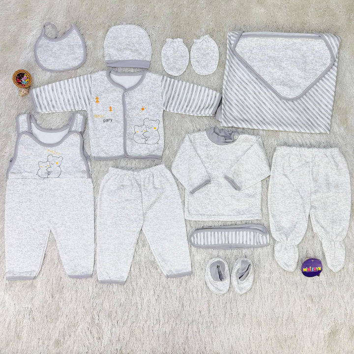 Product: 1 x open neck shirt, 1 x close neck shirt, 1 x dungaree, 1 x bib, 1 x cap, 1 x pair of mittens, 1 x pair of booties, 1 x belt, 1 x open end trouser, 1 x close feet trouser, 1 x wrapping shawl