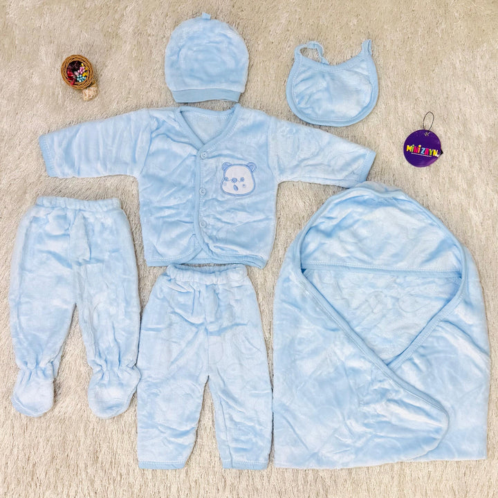 Product: 1 x open neck shirt, 1 x bib, 1 x cap, open end trouser, 1 x close feet trouser, 1 x wrapping shawl