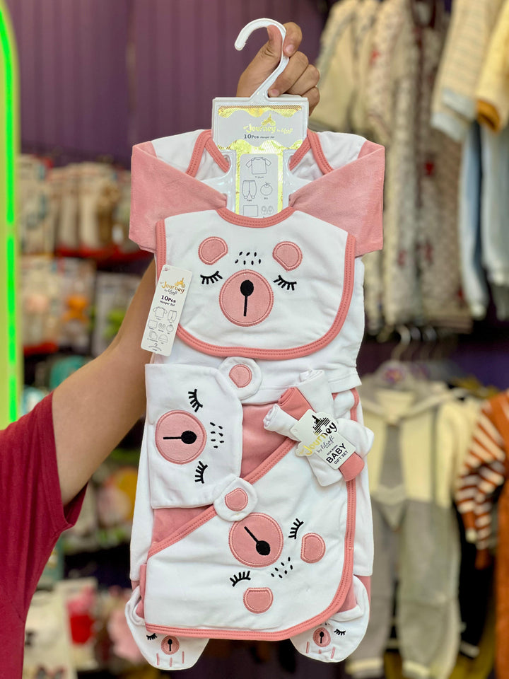 Product: 1 x shirt, 1 x trouser, 1 x cap, 1 x bib, 1 x pair of booties,1 x wrapping sheet, 3 x Wash Cloths
