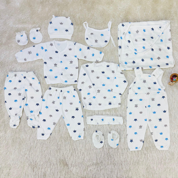 Product: 1 x open neck shirt, 1 x close neck shirt, 1 x dungaree, 1 x bib, 1 x cap, 1 x pair of mittens, 1 x pair of booties, 1 x belt, 1 x open end trouser, 1 x close feet trouser, 1 x wrapping shawl