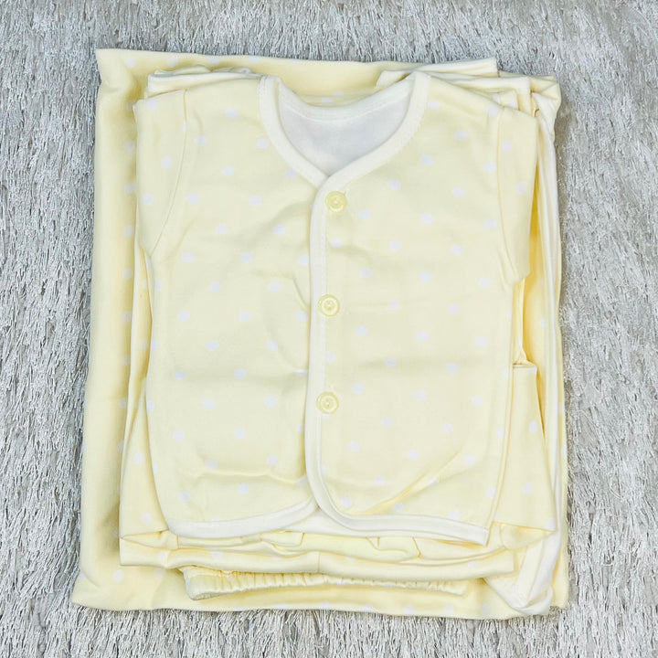 Product: 1 x open neck shirt, 1 x close neck shirt, 1 x dungaree, 1 x bib, 1 x cap, 1 x pair of mittens, 1 x pair of booties, 1 x belt, 1 x open end trouser, 1 x close feet trouser, 1 x wrapping shawl