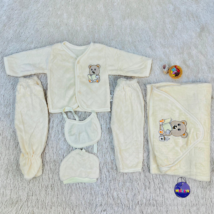 Product: 1 x open neck shirt, 1 x bib, 1 x cap, open end trouser, 1 x close feet trouser, 1 x wrapping shawl