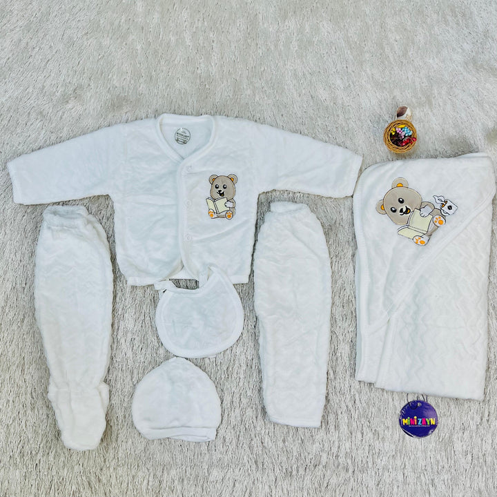 Product: 1 x open neck shirt, 1 x bib, 1 x cap, open end trouser, 1 x close feet trouser, 1 x wrapping shawl