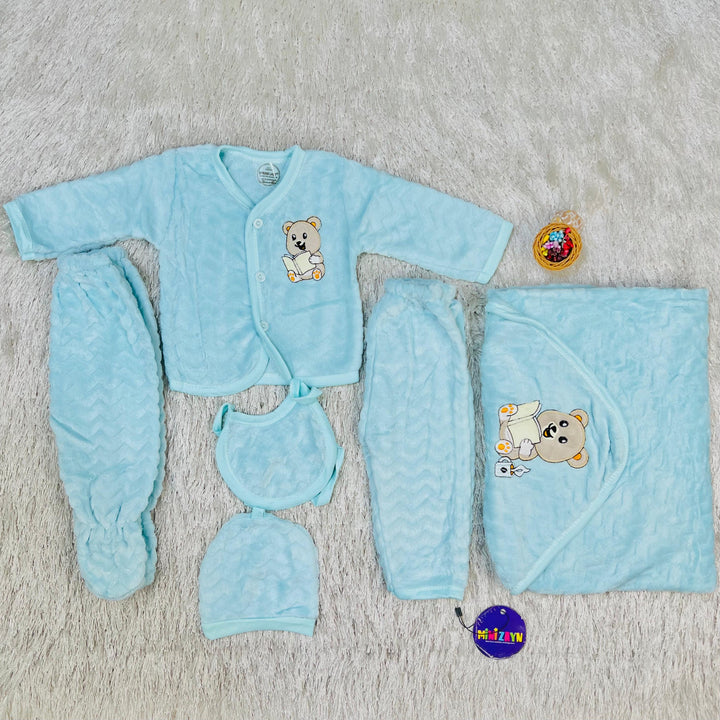 Product: 1 x open neck shirt, 1 x bib, 1 x cap, open end trouser, 1 x close feet trouser, 1 x wrapping shawl