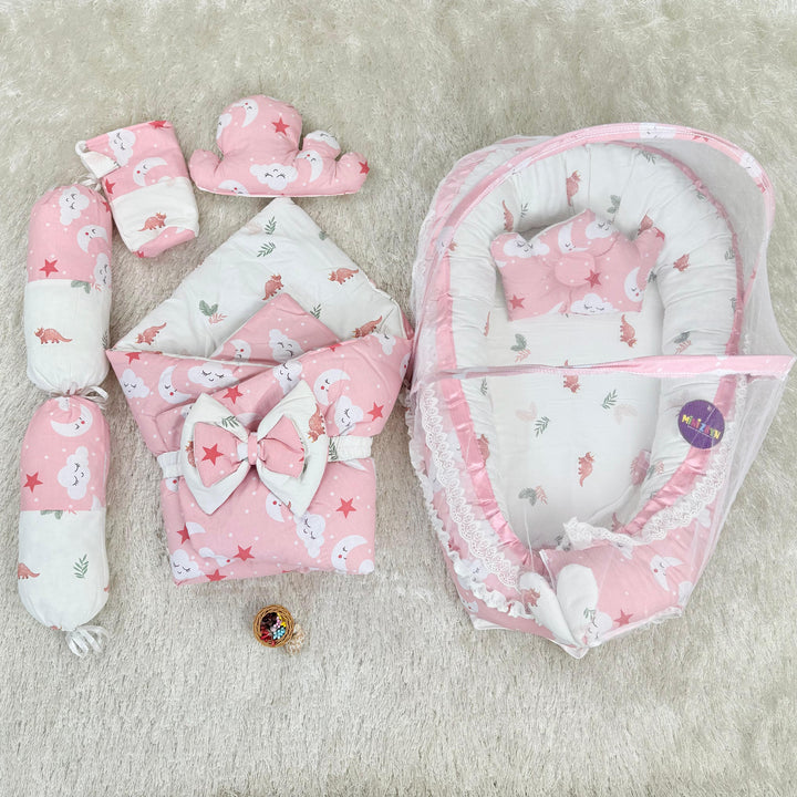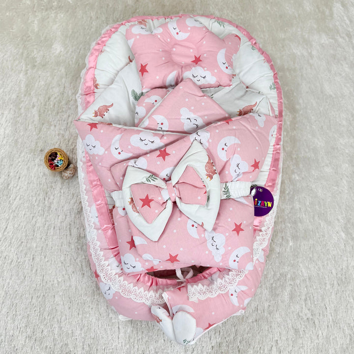 Product: 1x Snuggle bed, 1x pillow, 1x mosquito net, 1x carry nest, 1x pillow, 2x side pillows, 1x bottle cover, 1x belt