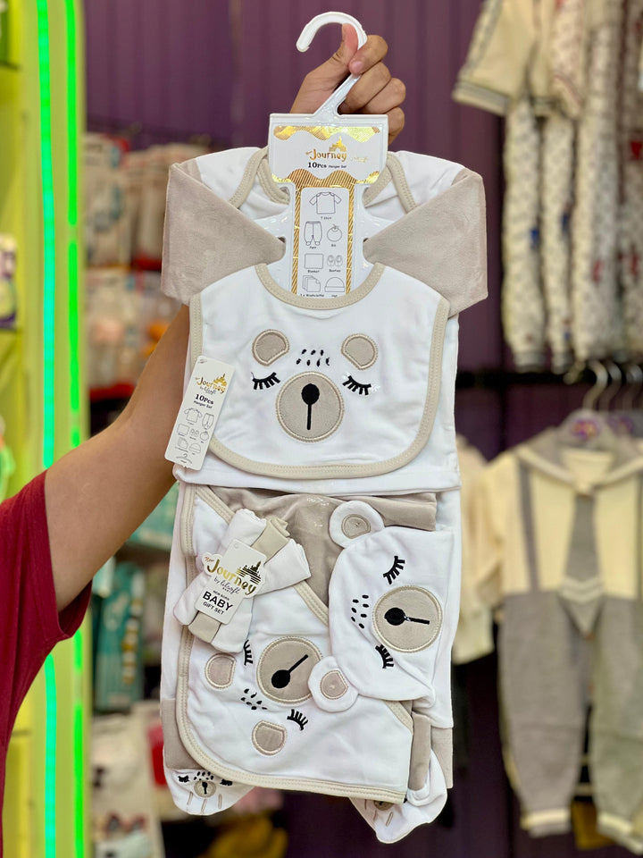 Product: 1 x shirt, 1 x trouser, 1 x cap, 1 x bib, 1 x pair of booties,1 x wrapping sheet, 3 x Wash Cloths