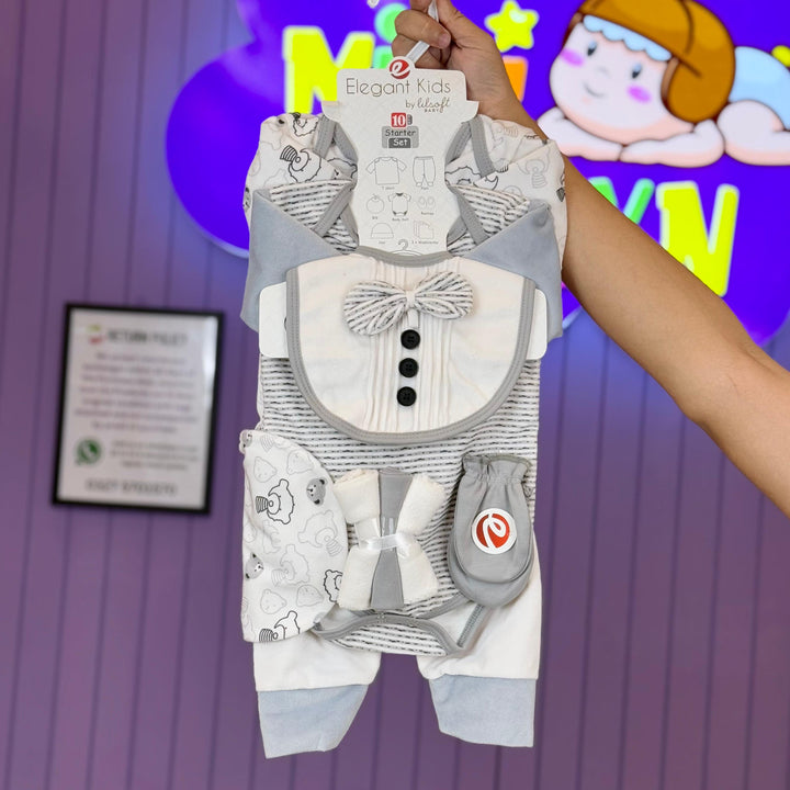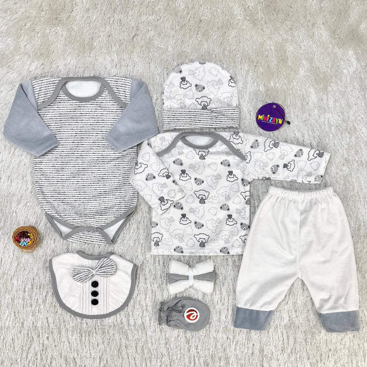 Product: 1 x shirt, 1 x trouser, 1x bodysuit , 1 x cap, 1 x bib, 1 x pair of booties, 3 x Wash Cloths