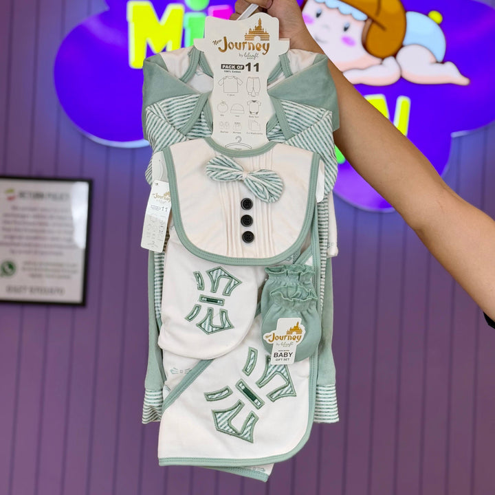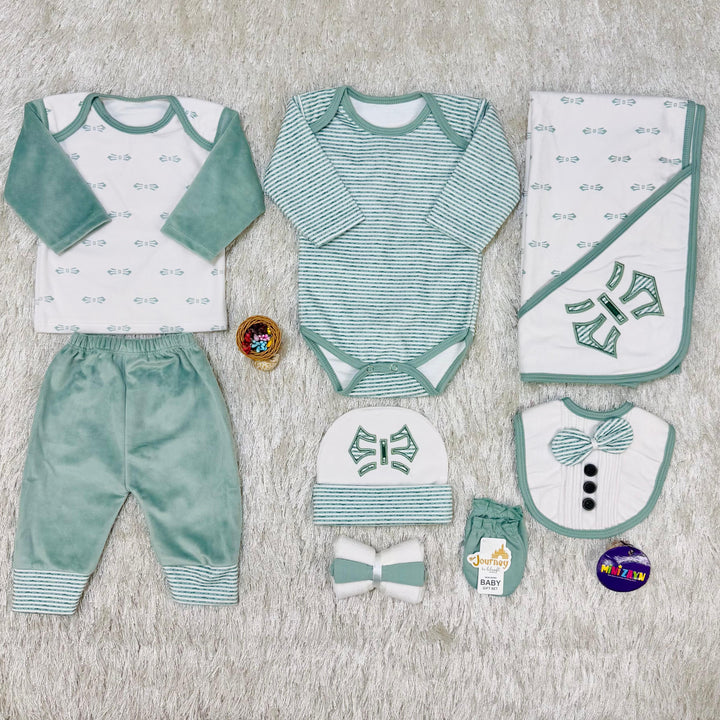 Product: 1 x shirt, 1 x trouser, 1 x cap, 1 x bib, 1 x pair of booties , 1 x pair of mittens 1 x wrapping sheet, 3 x Wash Cloths
