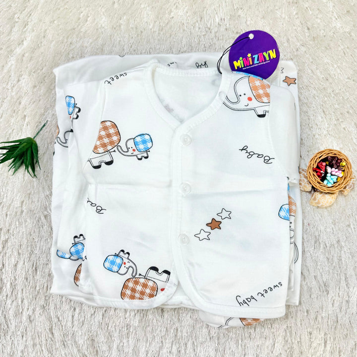 Product: 1 x open neck shirt, 1 x close neck shirt, 1 x dungaree, 1 x bib, 1 x cap, 1 x pair of mittens, 1 x pair of booties, 1 x belt, 1 x open end trouser, 1 x close feet trouser, 1 x wrapping shawl