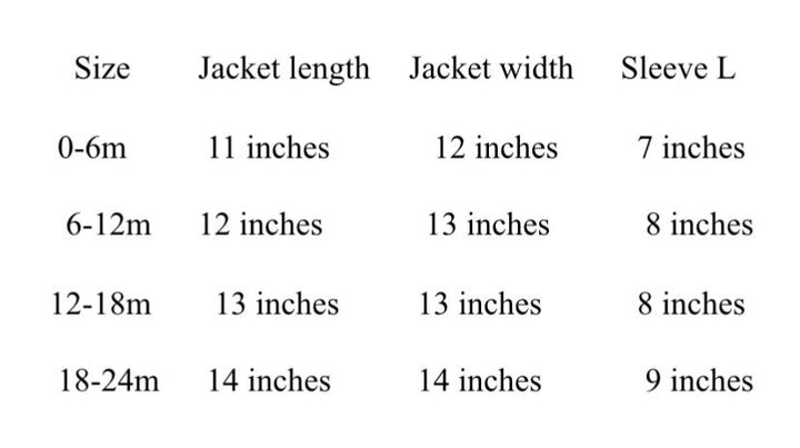 Jacket Length : 11 inches , Jacket Width : 12 inches ,Sleeve L : 7 inches