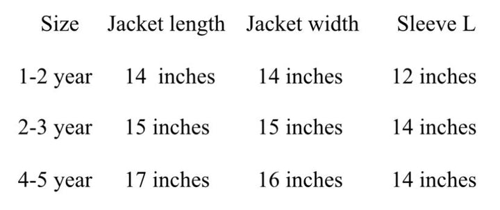 - Jacket Length: 14 inches , Width: 14 inches, sleeves: 12 inches