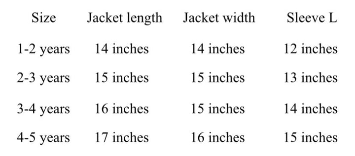 - Jacket Length: 14 inches , Width: 14 inches, sleeves: 12 inches