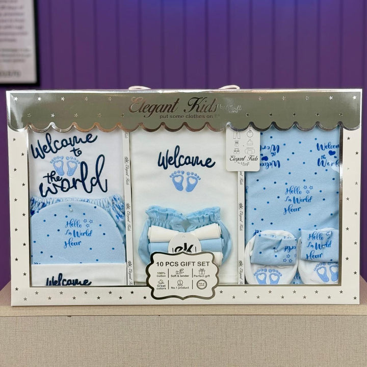 Product: 1 x Shirt, 1 x trouser, 1x bodysuit , 1 x Bib, 1 x Cap , 2 x booties, 1x mittens, 3x wash clothes