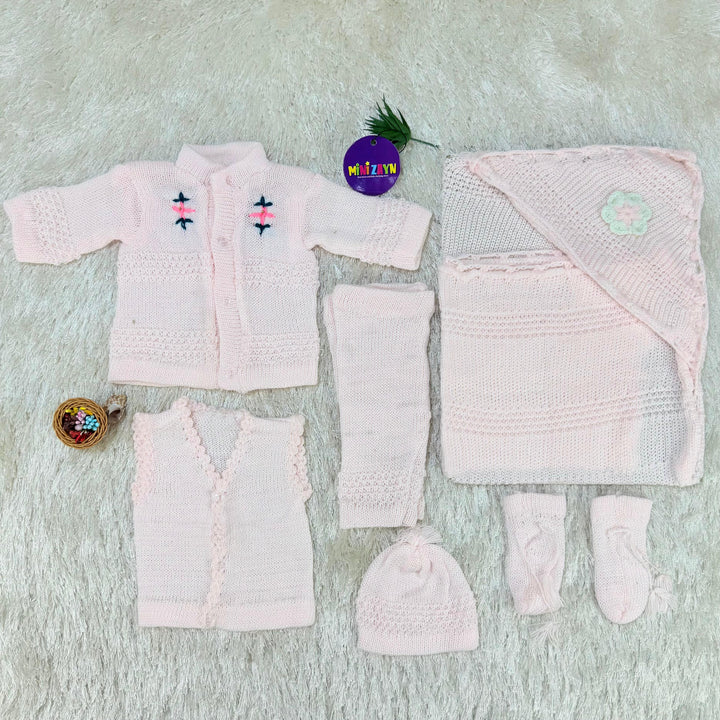 product: 1 x shirt, 1x Vest,1 x trouser, 1 x cap, 1 x pair of booties, 1 x wrapping sheet
